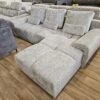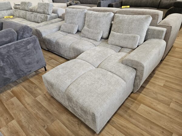 Lysgrå hjørnesofa med sovefunktion og opbevaringsboks. Chaiselongen kan monteres på begge sider, hvilket gør sofaen universel og nem at tilpasse til dit rum. Blød, komfortabel og med dekorative puder.