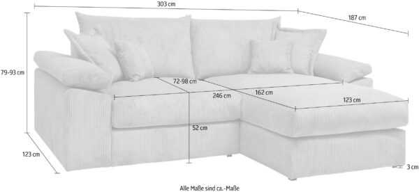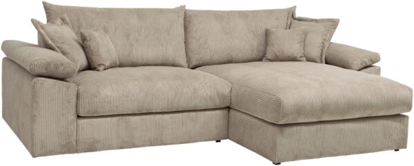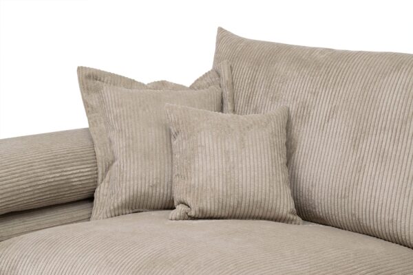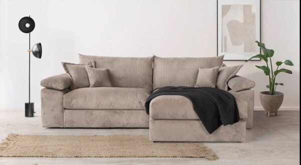 Udført i ultra-blød cord- eller chenille-stof, med fjedre i sædet og 4 pyntepuder – perfekt til hyggelige stunder med familie og venner.