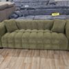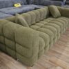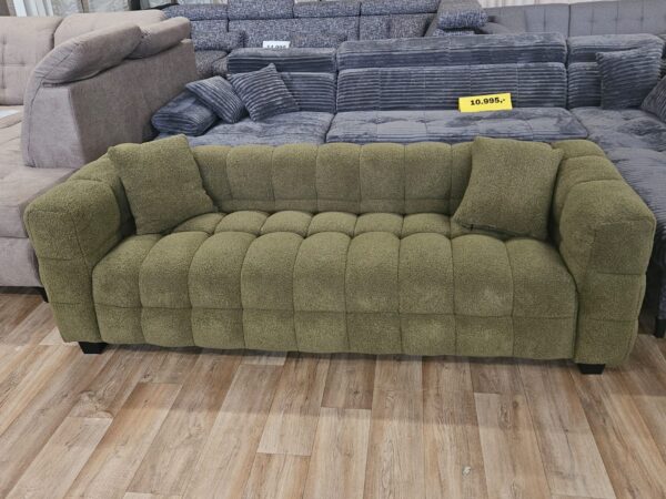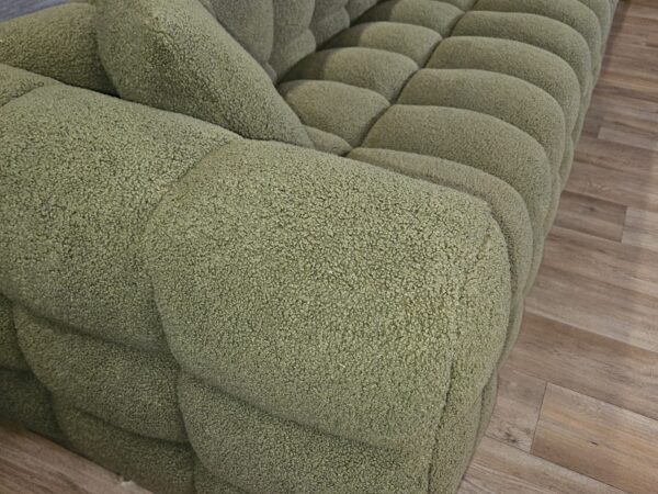 ▪Stilfuld og moderne sofa betrukket med blødt, grønt bouclé-stof.