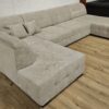 Dette er en U-formet sofa med neutral, lysegrå polstring. Sofaen har et firkantet quiltet design, og dens form giver mulighed for komfortabel siddeplads eller lounging. Det ser rummeligt ud og velegnet til større rum. Den er desuden dekoreret med flere hynder, der tilføjer hygge.