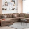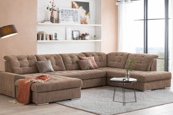 Denne lyse hjørnesofa kombinerer stil og funktionalitet. Den er betrukket med elegant bredriflet velour, som både er blød og slidstærk, og tilføjer en luksuriøs følelse til stuen.