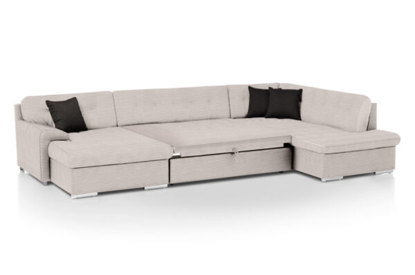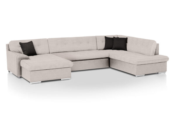 Den moderne og rummelige ROCKY U-sovesofa kombinerer komfort, funktionalitet og stil i ét praktisk møbel. Sofaen er betrukket med blødt fløjl, som giver et varmt og elegant udtryk i stuen, samtidig med at det er behageligt at sidde og ligge på.